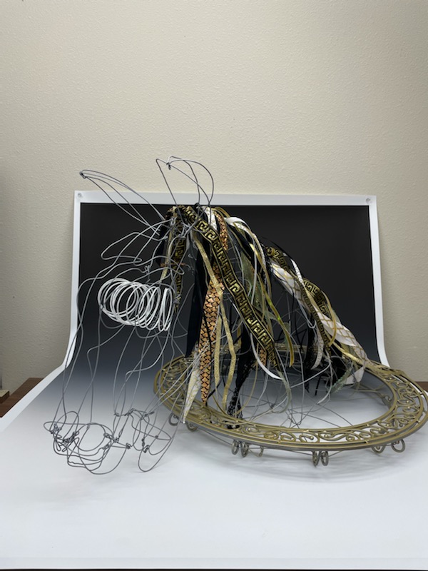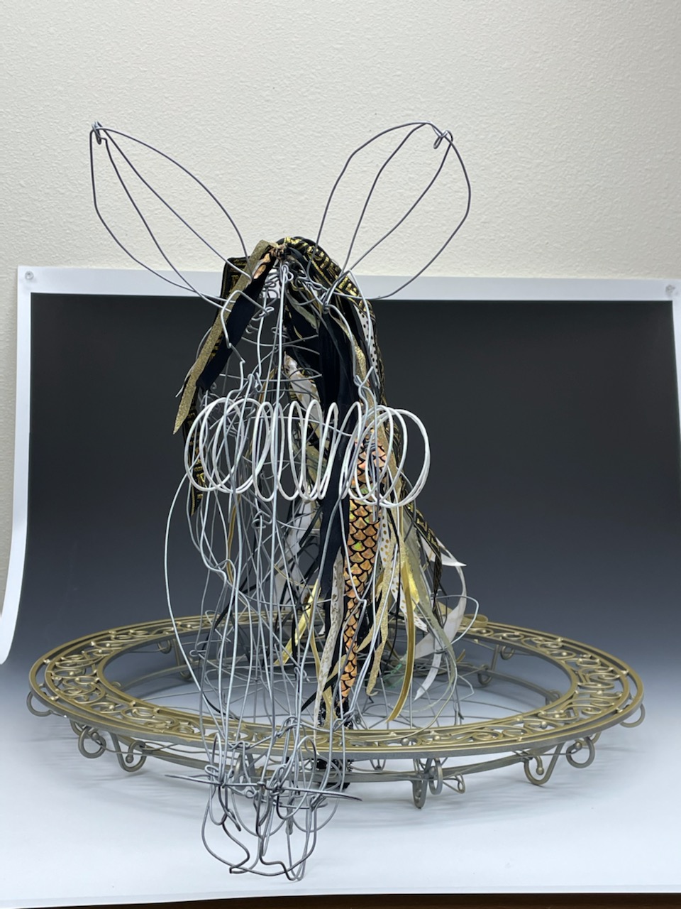 Single Wire Sculpture, Spray Paint, Acrylic Paint, Ribbon, Salvaged Clock
