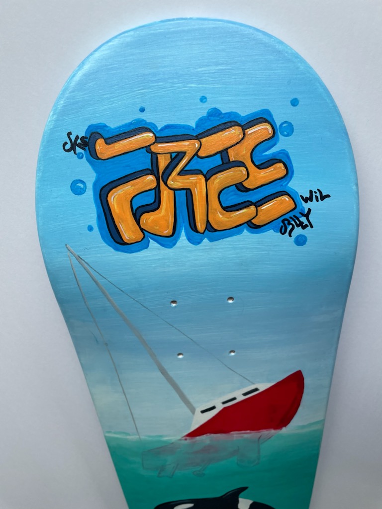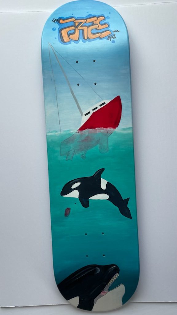 “Freewill” Acrylic paint and Polyurethane Varnish on Skateboard Deck
