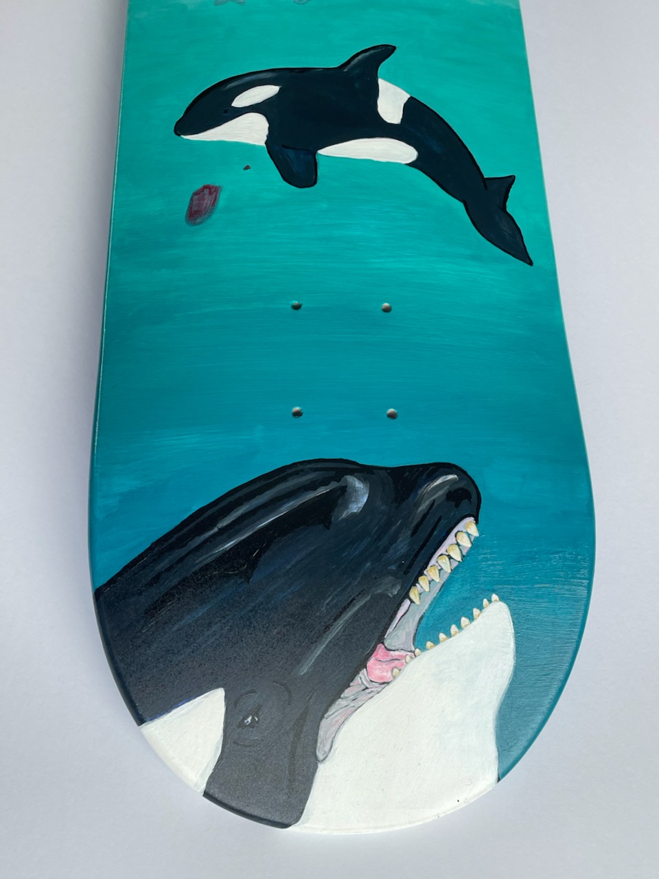 Spray paint, paint markers, and polyurethane varnish on skateboard deck